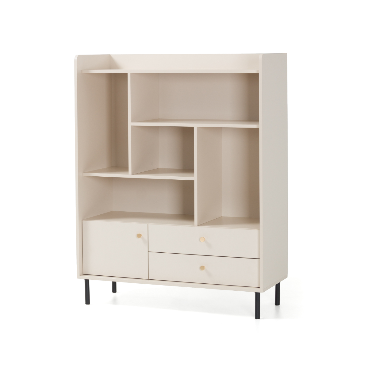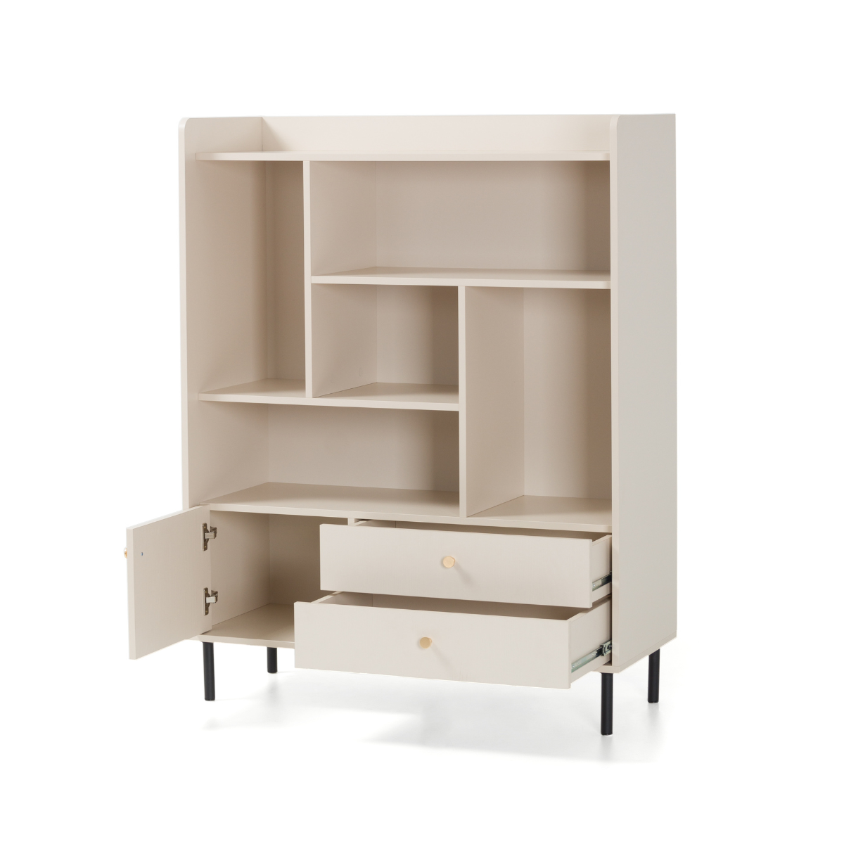 Smėlio spalva suteikia modeliui šiltą ir elegantišką išvaizdą, o juodos kojelės ir auksiniai rankenėlės prideda modernumo ir rafinuotumo.