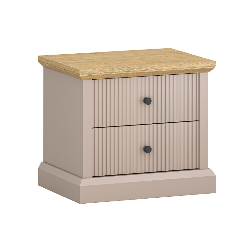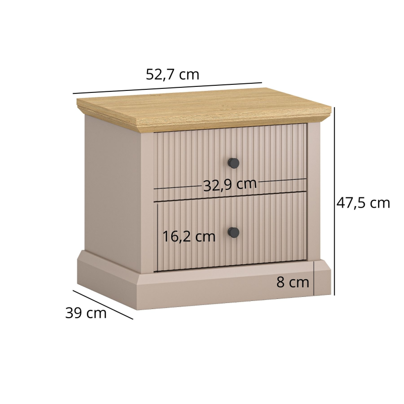 Fasadų medžiaga: Rėmas: MDF + HDF / Grioveliai: MDF Fasadų spalva: Pilkai ruda TAUPE Korpuso medžiaga: laminuota baldų plokštė Korpuso spalva: pilkai pilka TAUPE Viršutinė medžiaga: laminuota baldų plokštė Viršutinė spalva: akmens ąžuolas Stalčiai: rutuliniai guoliniai pilno ištraukimo bėgeliai Metalinės rankenos MDF koja Surinkimas: Baldai supakuoti plokščiose pakuotėse, skirti savarankiškam surinkimui Svoris: 18,0 kg