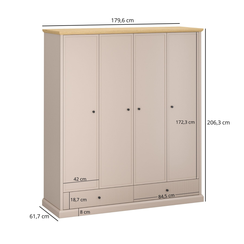 Fasadų medžiaga: Rėmas: MDF + HDF / Grioveliai: MDF Fasadų spalva: Pilkai ruda TAUPE Korpuso medžiaga: Laminuota baldų plokštė Korpuso spalva: Pilkai ruda TAUPE Viršutinės dalies medžiaga: Laminuota baldų plokštė Viršutinės dalies spalva: Akmens ąžuolas Stalčiai: Su rutuliniai pilno ištraukimo guoliniai bėgeliai Metalinės rankenos MDF koja Lentynos: Baldinė plokštė Leidžiama apkrova: Lentynos 5 kg Surinkimas: Baldai supakuoti į plokščias pakuotes savarankiškam surinkimui Svoris: 160,4 kg