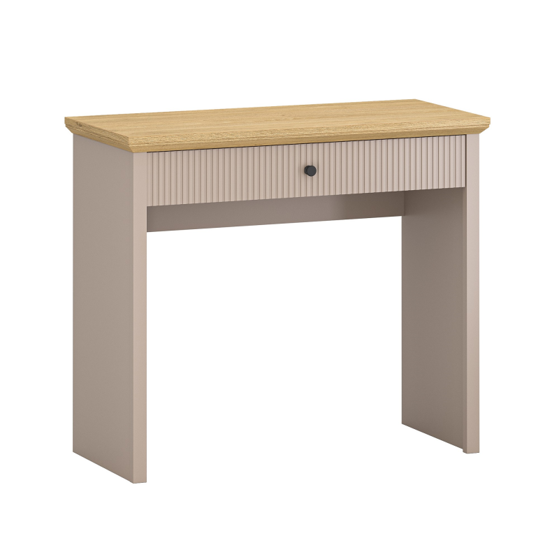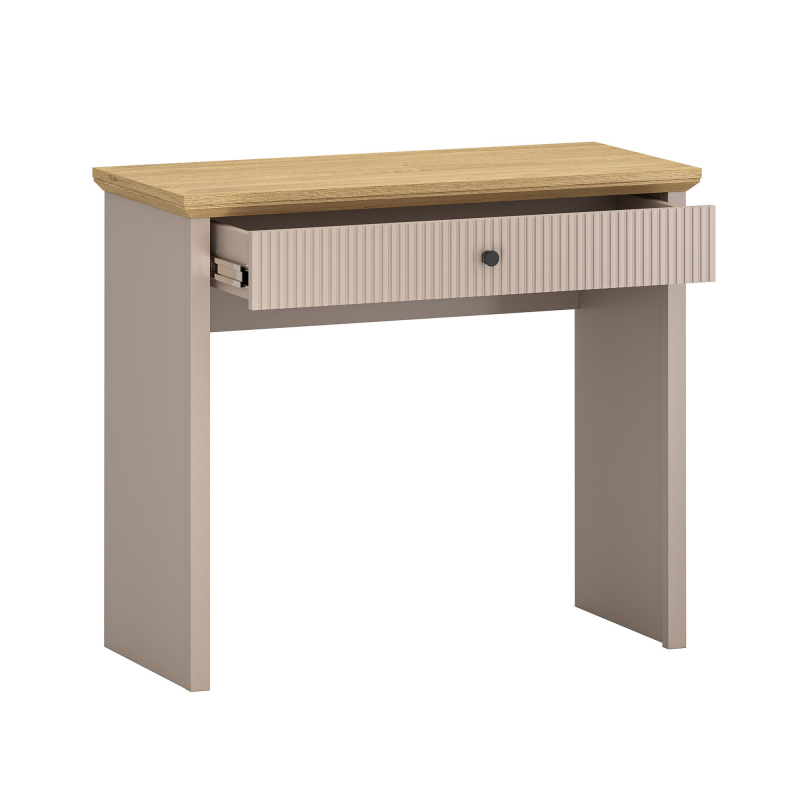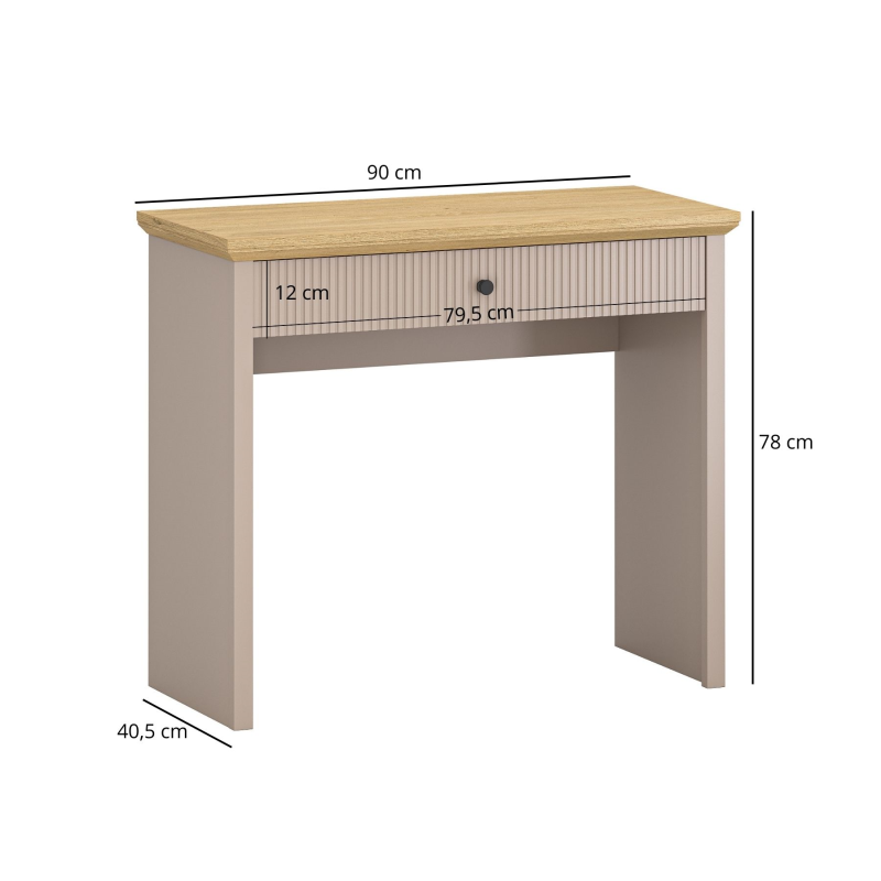 Fasadų medžiaga: Rėmas: MDF + HDF / Grioveliai: MDF Fasadų spalva: Pilkai ruda TAUPE Korpuso medžiaga: laminuota baldų plokštė Korpuso spalva: pilkai pilka TAUPE Viršutinė medžiaga: laminuota baldinė plokštė Viršutinės dalies spalva: akmens ąžuolas Stalčiai: rutuliniai pilno ištraukimo guoliniai bėgeliai Rankenos: metalinės Koja: baldinė plokštė Surinkimas: Baldai pristatomi plokščiose pakuotėse, kad būtų galima surinkti savarankiškai Svoris: 19,8 kg
