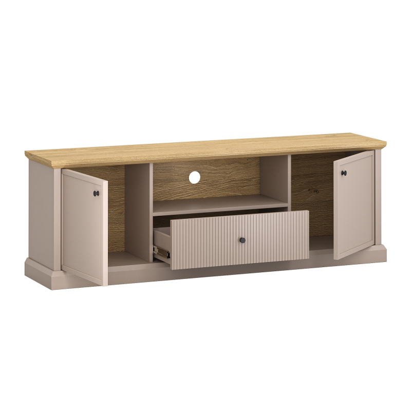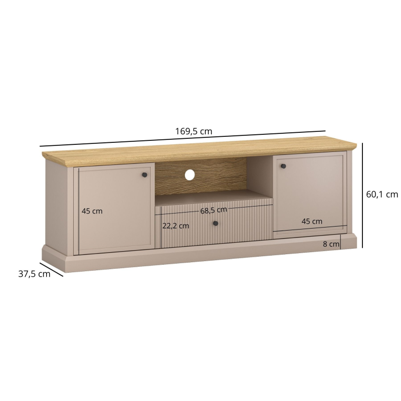 Fasadų medžiaga: Rėmas: MDF + HDF / Grioveliai: MDF Fasadų spalva: Pilkai ruda TAUPE Korpuso medžiaga: Laminuota baldų plokštė Korpuso spalva: Pilkai ruda Viršutinė medžiaga: Laminuota baldų plokštė Viršutinė spalva: Akmens ąžuolas Stalčiai: Pilno ištraukimo rutuliniai guoliniai bėgeliai Metalinės rankenos MDF koja Lentynos: Baldinė plokštė Leidžiama lentynų apkrova 5 kg Surinkimas: Baldai supakuoti savarankiškam surinkimui Svoris: 41,6 kg