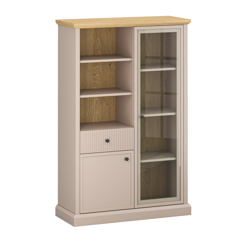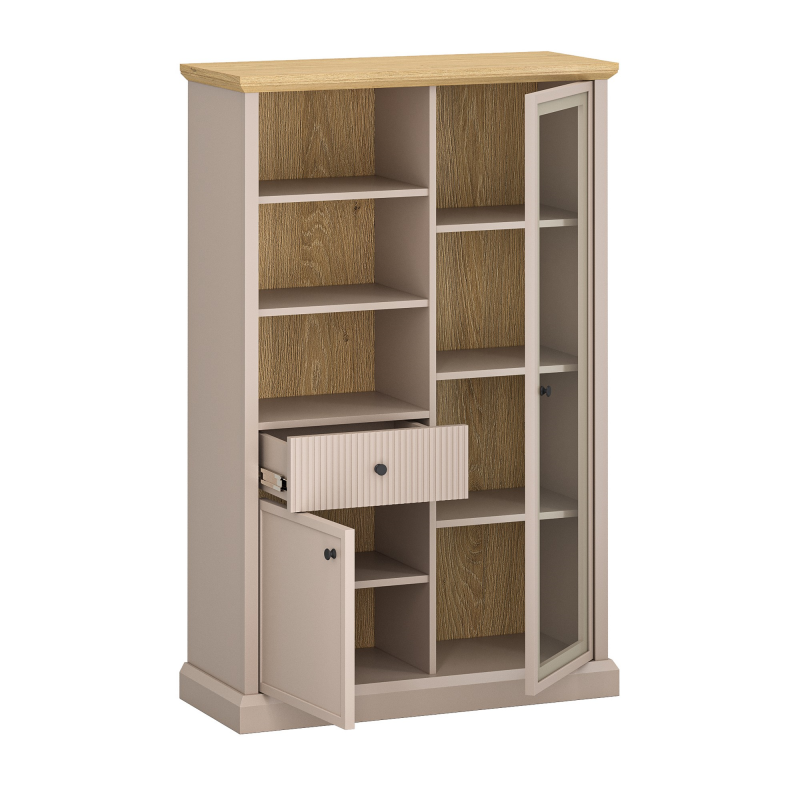 Fasadų medžiaga: Rėmas: MDF + HDF / Grioveliai: MDF Fasadų spalva: Pilkai ruda TAUPE Priekinės dalys su stiklu – stiklo tipas: skaidrus Korpuso medžiaga: Laminuota baldų plokštė Korpuso spalva: Pilkai ruda TAUPE Viršutinė medžiaga: Laminuota baldų plokštė Viršutinės dalies spalva: Ąžuolas akmeninis Stalčiai: Rutuliniai guoliniai pilno ištraukimo bėgeliai Metalinės rankenos MDF koja Lentynos: Baldinė plokštė Leidžiama lentynų apkrova 5 kg Surinkimas: Baldai skirti savarankiškam surinkimui Svoris: 52,8 kg