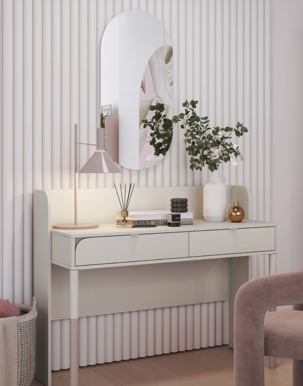 Kolekcija yra kašmyro spalvos, kolekcijoje akcentuojamos užapvalintos formos ir užapvalintos briaunos, todėl baldai yra ypač saugūs ir patrauklūs.