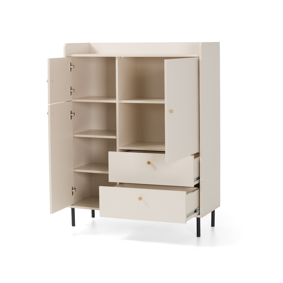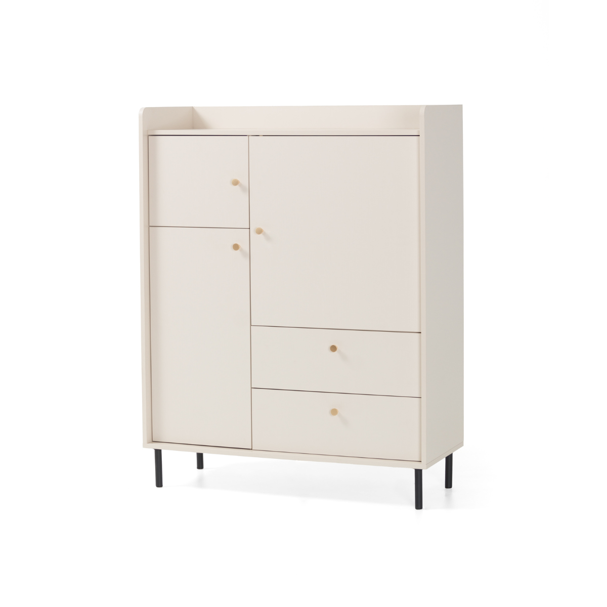 Smėlio spalvos apdaila suteikia baldams elegancijos ir sukuria jaukumo pojūtį. Auksinės rankenos ir juodos metalinės kojelės pabrėžia šiuolaikinį kolekcijos charakterį ir suteikia išskirtinumo.