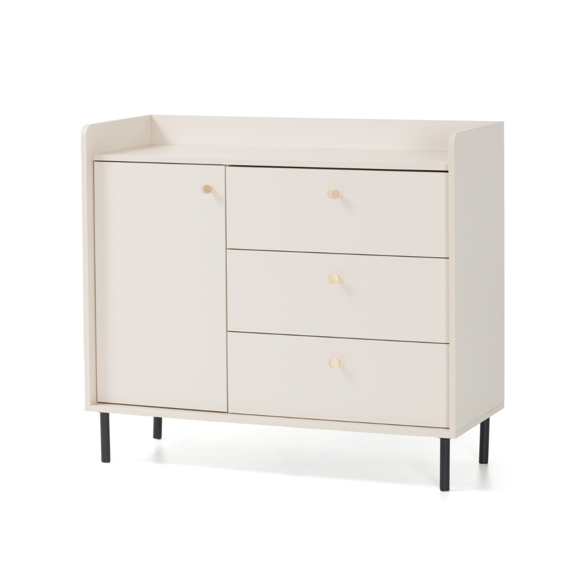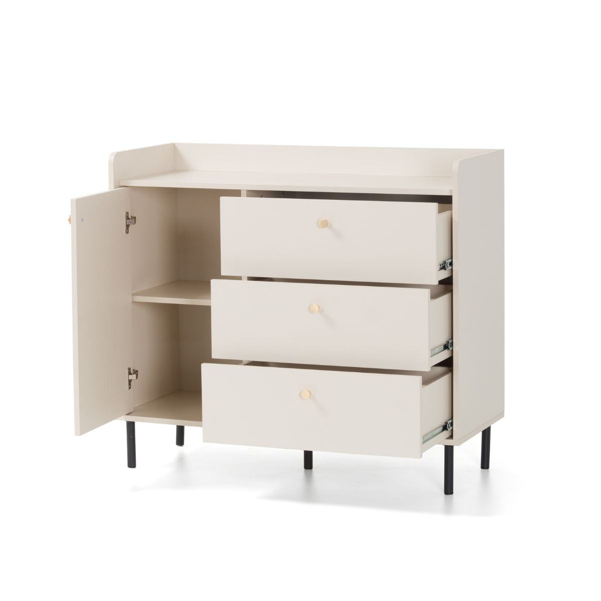 Komoda GRANDE GR-6 – tai elegantiškas ir praktiškas interjero elementas, pagamintas subtilaus smėlio spalvos atspalvio. Modelis derina minimalistinį dizainą ir funkcionalumą: trys talpūs stalčiai idealiai tinka smulkmenoms, skalbiniams ar dokumentams laikyti, o už atverčiamų durelių slepiasi papildoma lentyna didesniems daiktams.
