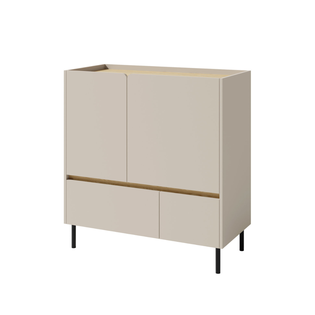 Dėl lakoniško dizaino ir madingo spalvų derinio, smėlio/ąžuolo spalvų, komoda lengvai įsilieja į įvairius interjerus. Metalinės kojos suteikia konstrukcijai lengvumo ir stabilumo.