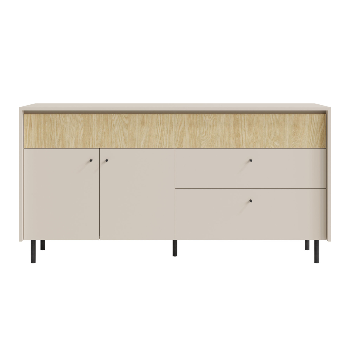 Komoda stovi ant plonų juodų kojelių, kurios suteikia konstrukcijai lengvumo ir vizualaus lengvumo, o juodos rankenos pabrėžia modernaus stiliaus gaminiui.