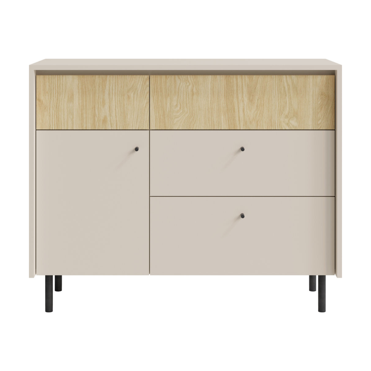 Modelis pagamintas subtilioje spalvų gammoje: smėlio spalva ir alyvuotas ąžuolas, todėl komoda yra universalus sprendimas įvairiems interjerams.