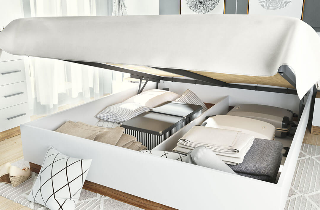 Lova komplektacijoje turi didelę talpią patalynės dėžę bei įmontuotą apšvietimą.