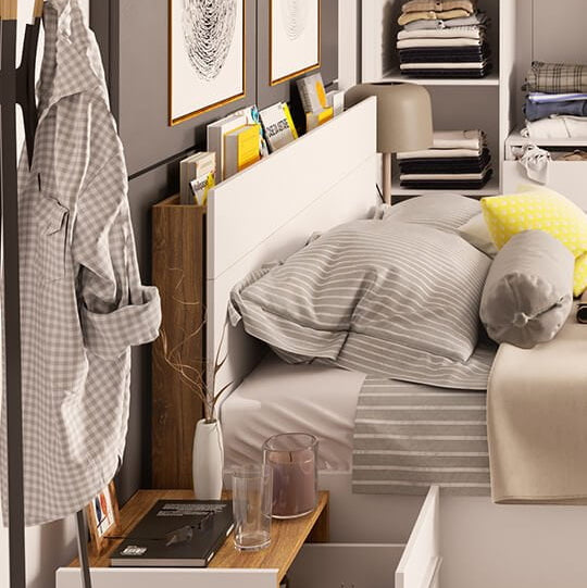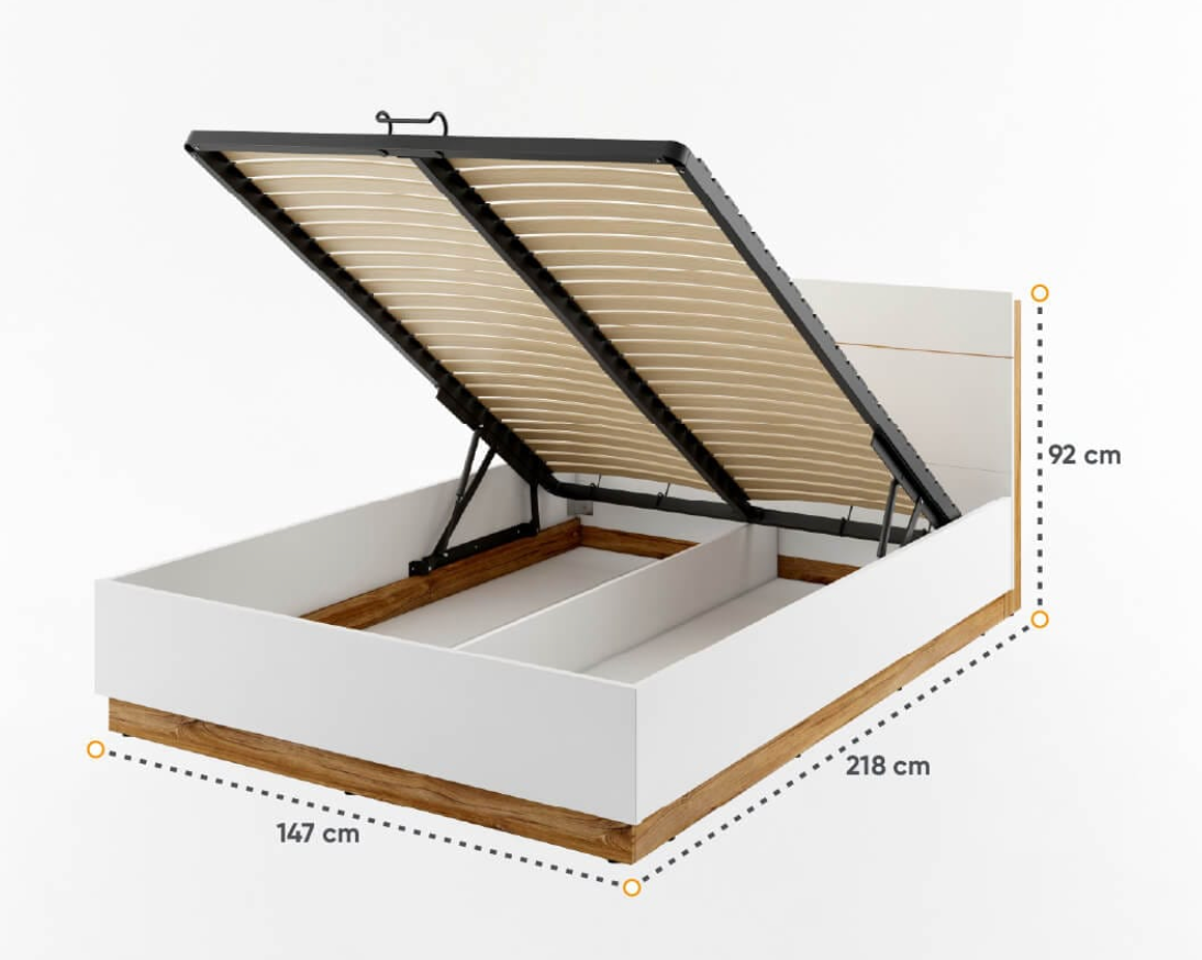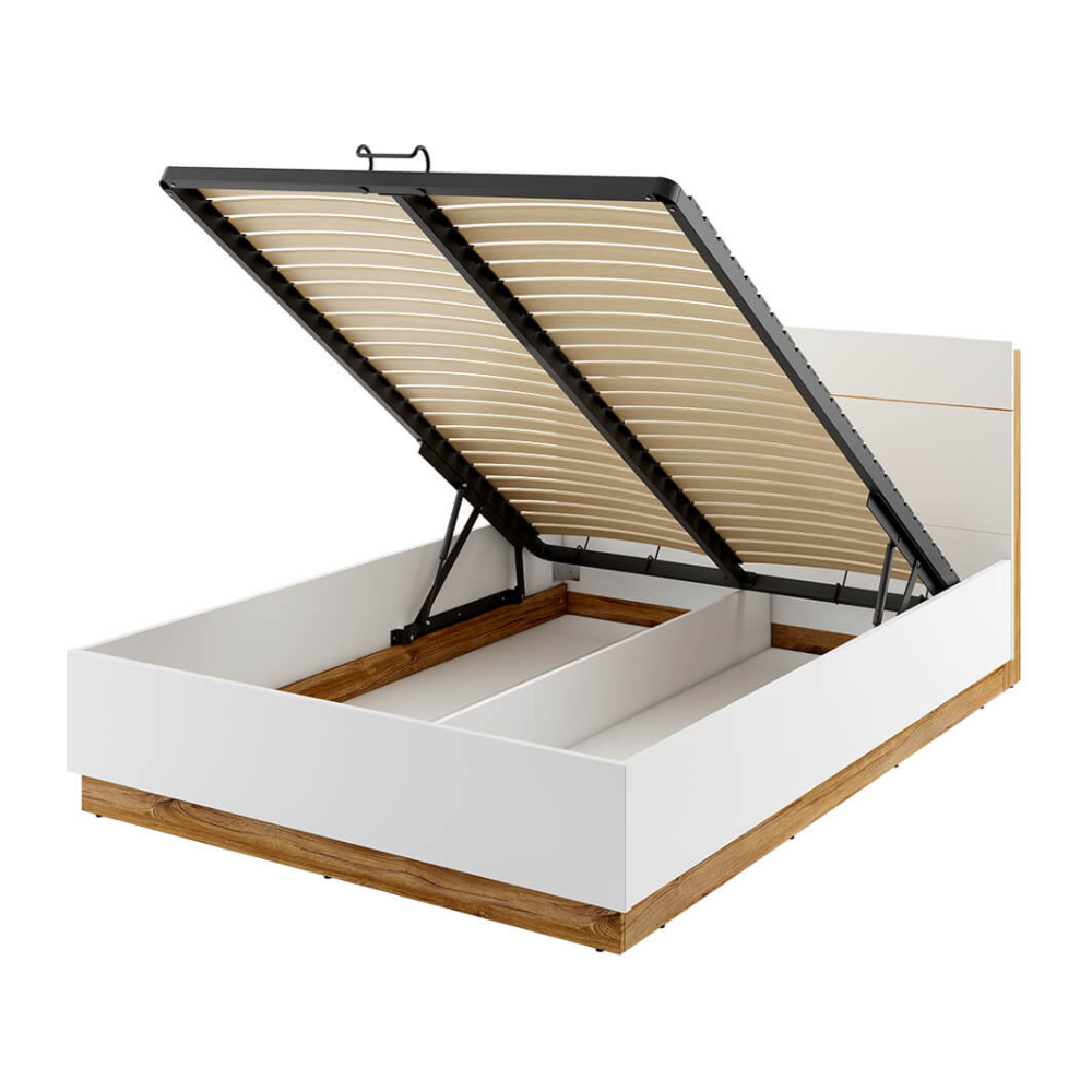 DENTRO lova - tai lakoniškas ir elegantiškas pasirinkimas moderniam miegamajam. Tiesios formos, baltas matinis korpusas ir šilti medžio akcentai sukuria jaukią ir švarią atmosferą. Aukštas galvūgalio galvūgalis suteikia komforto, o stabili konstrukcija garantuoja patikimumą.