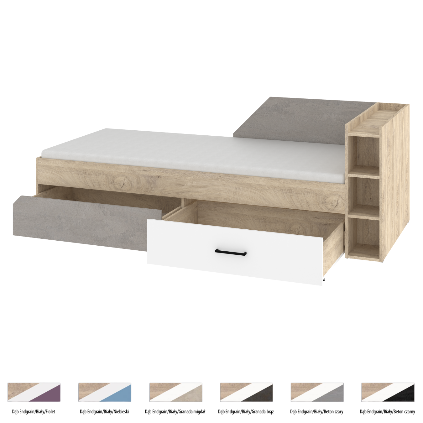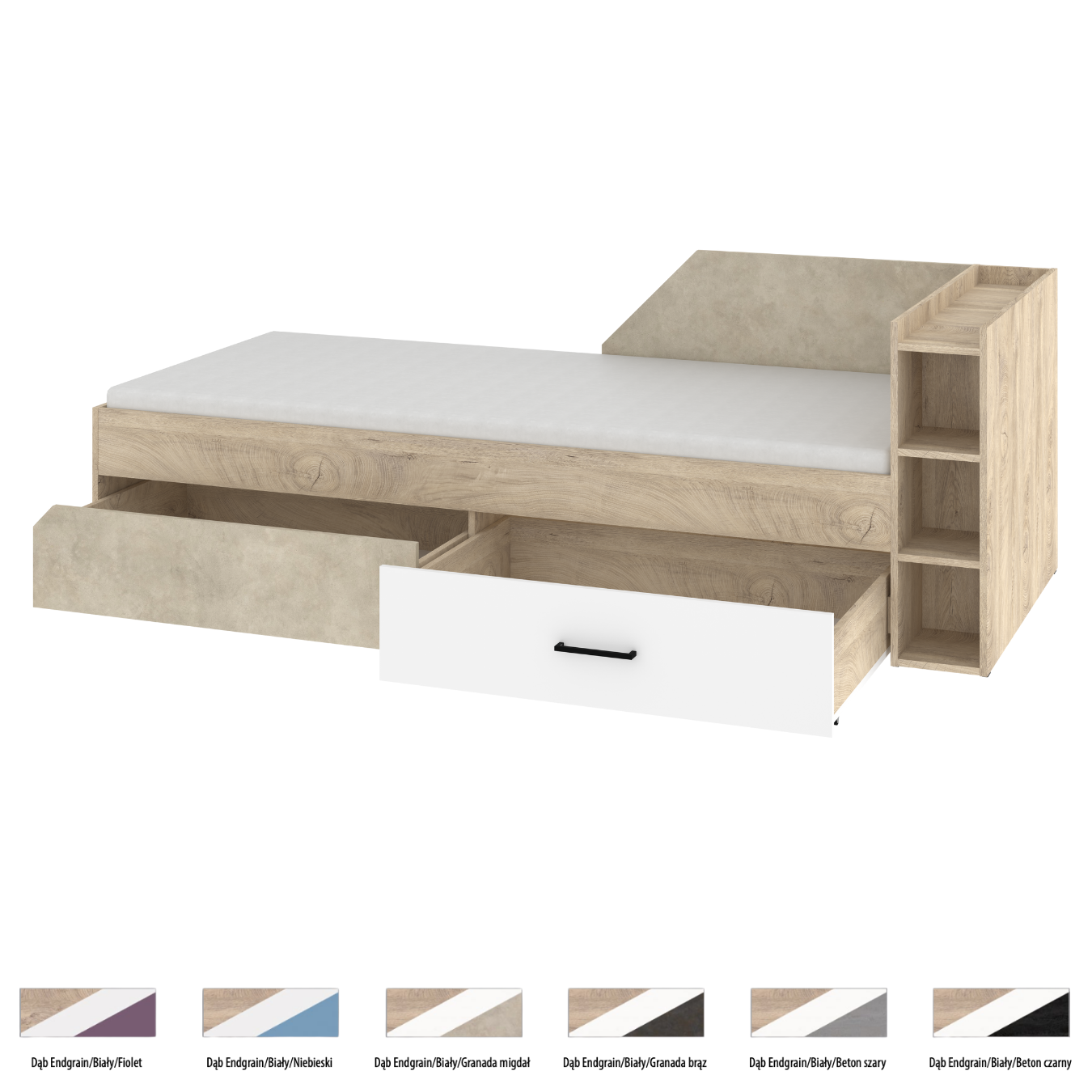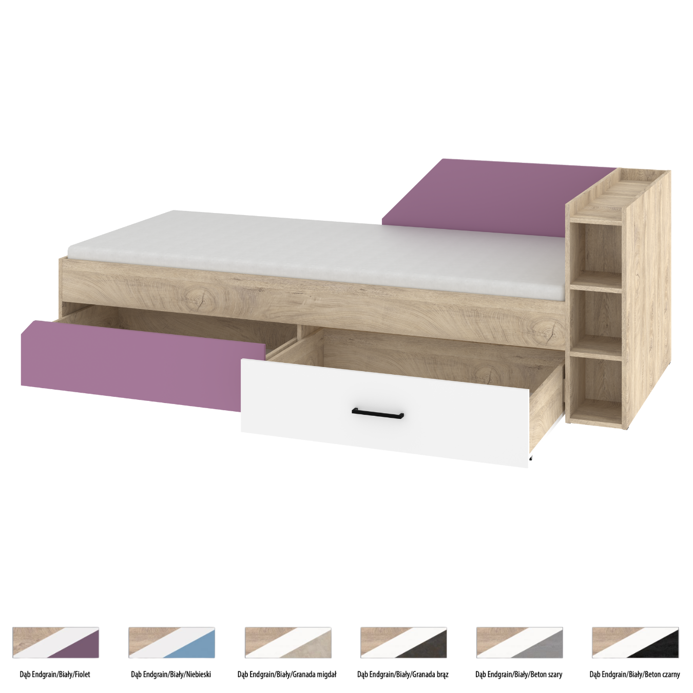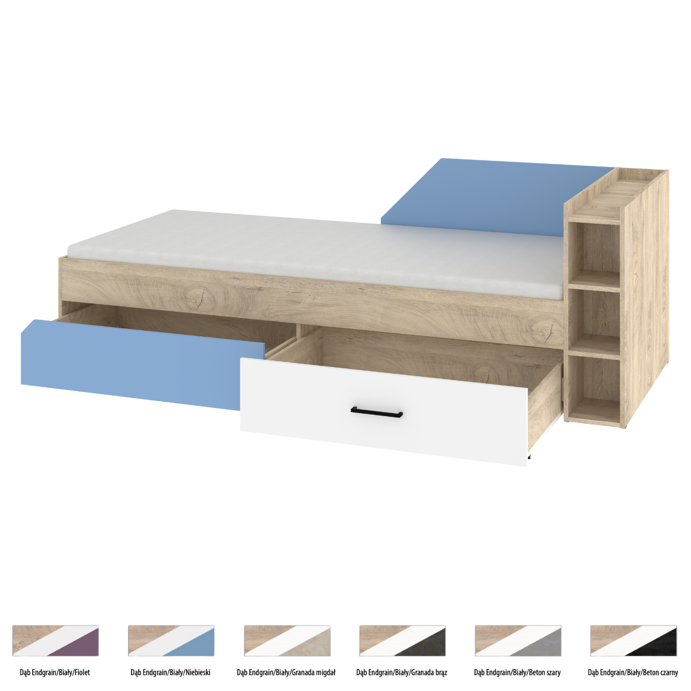 Lova turi du ištraukiamus stalčius., galvūgalis su šoninėmis lentynomis ir vieta daiktams laikyti.