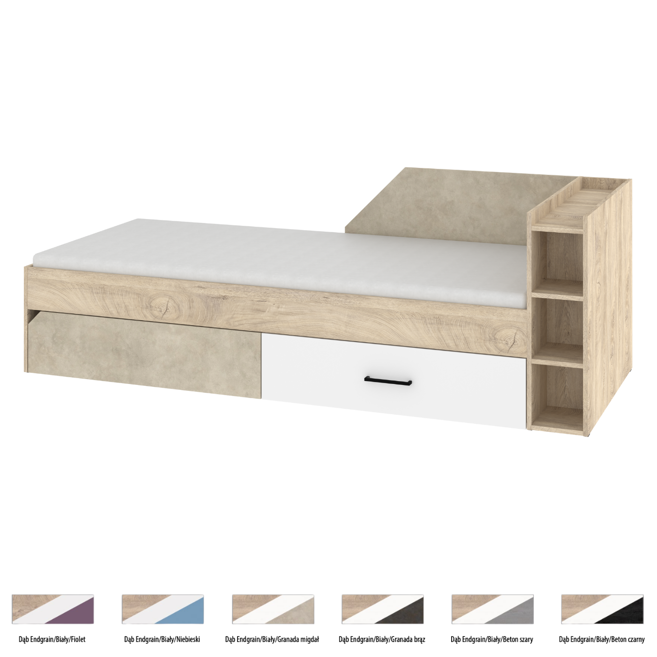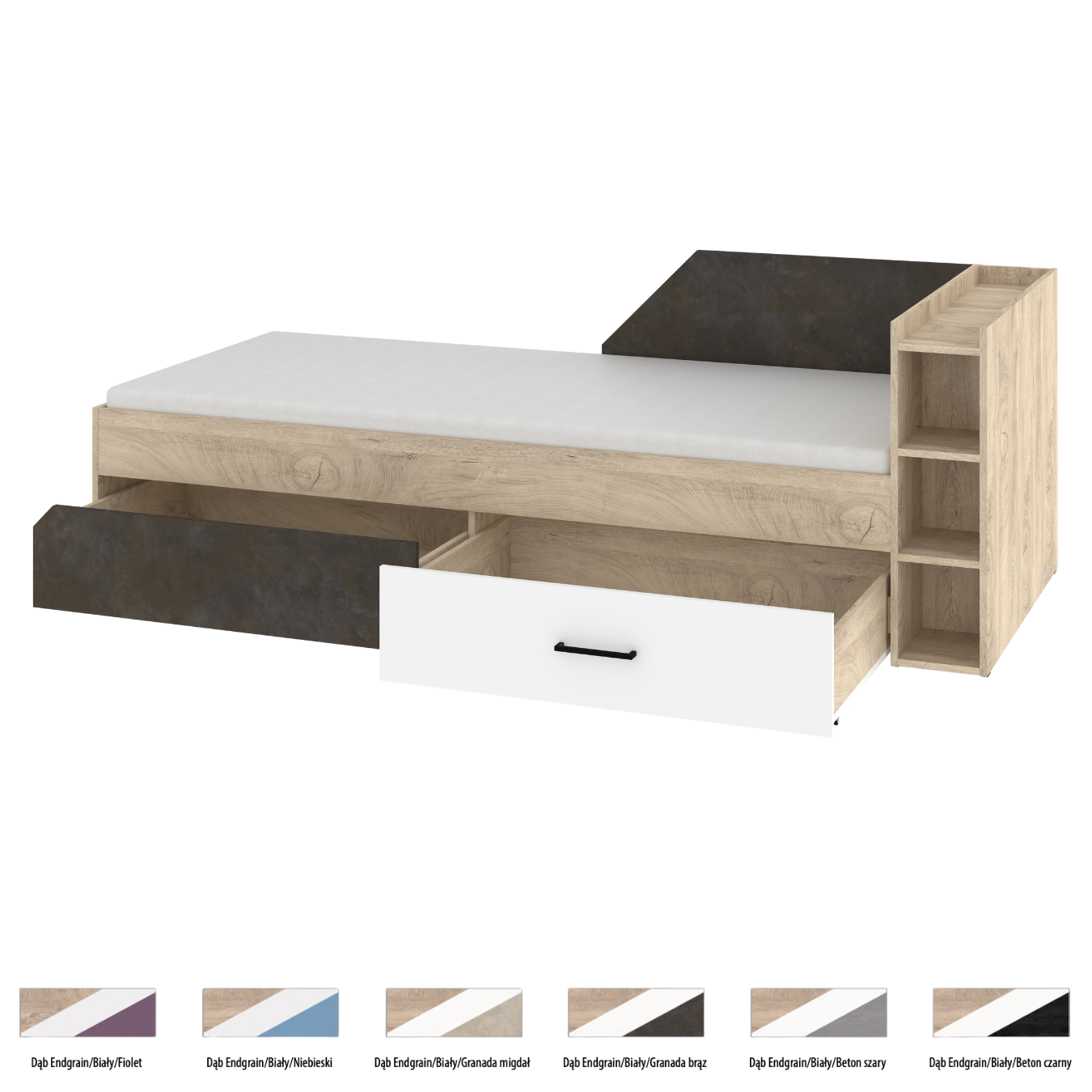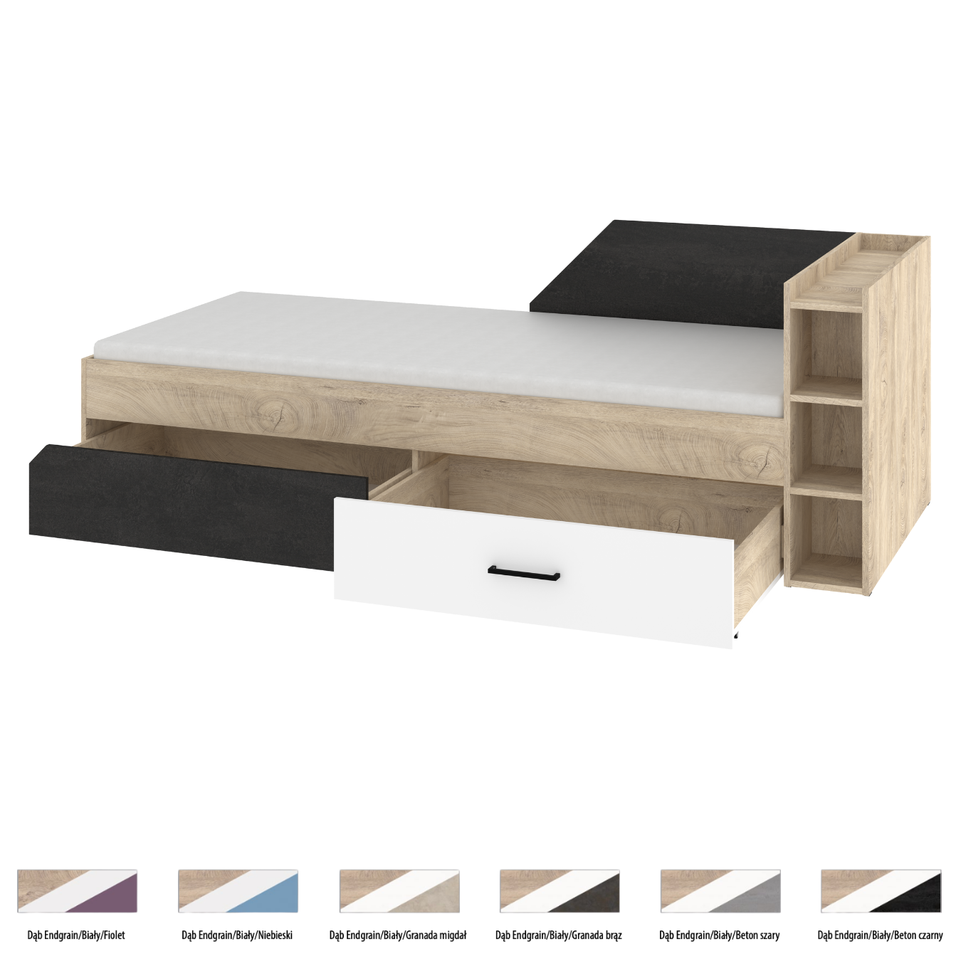 Lova turi du ištraukiamus stalčius., galvūgalis su šoninėmis lentynomis ir vieta daiktams laikyti.