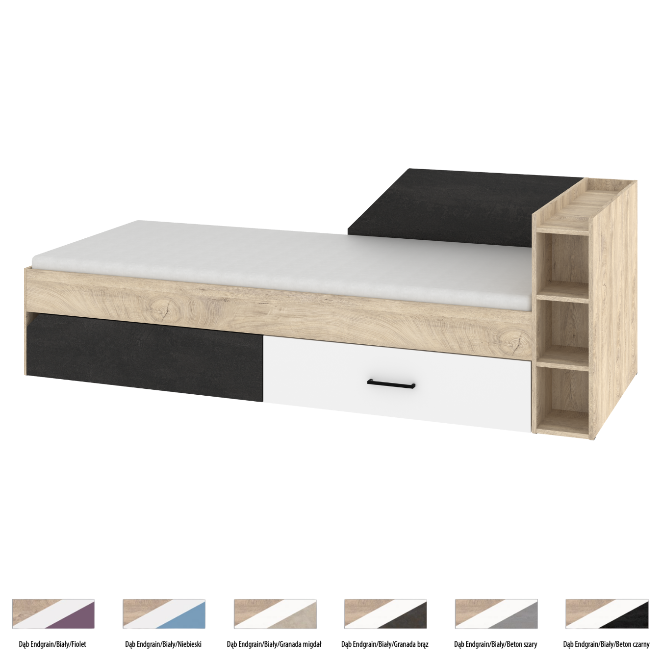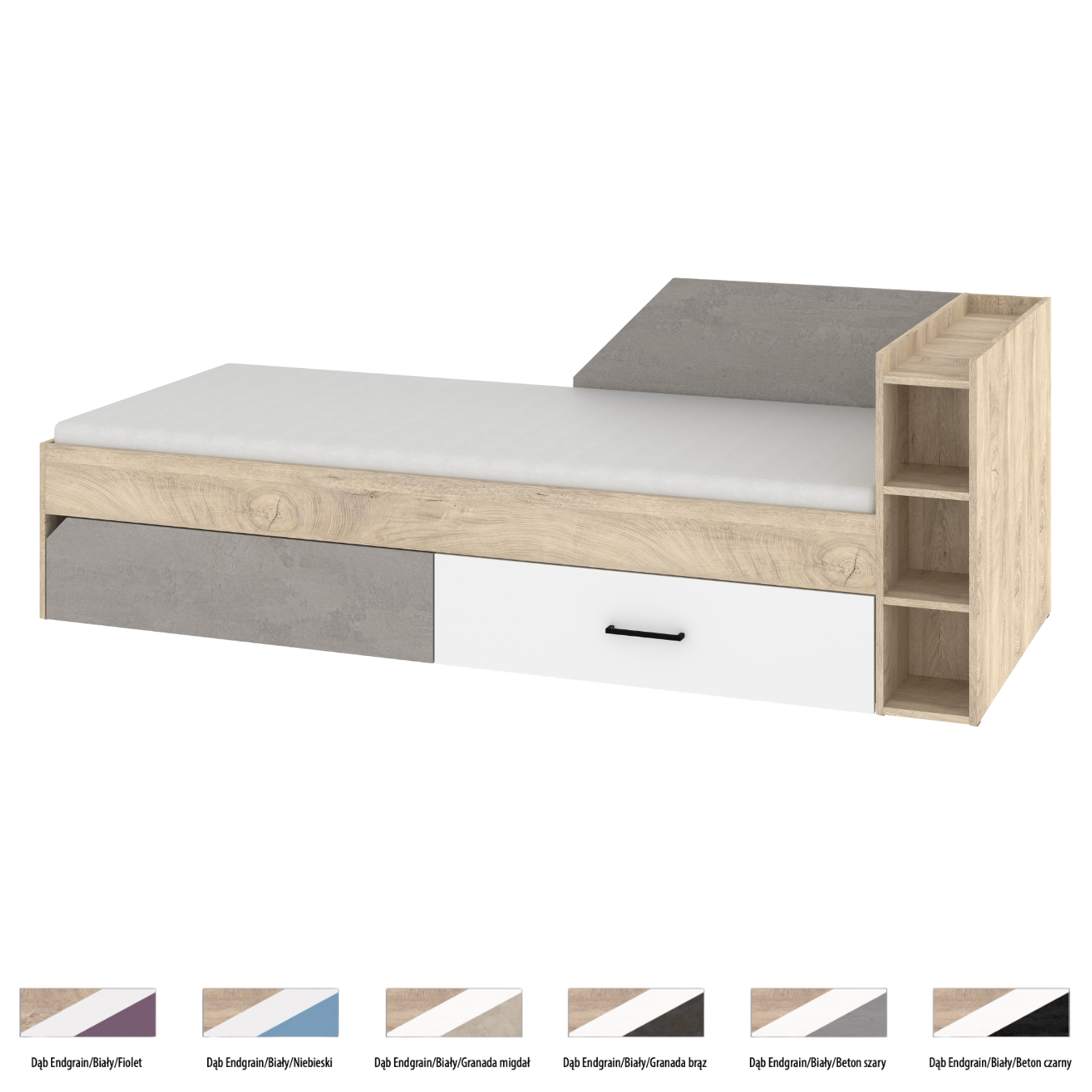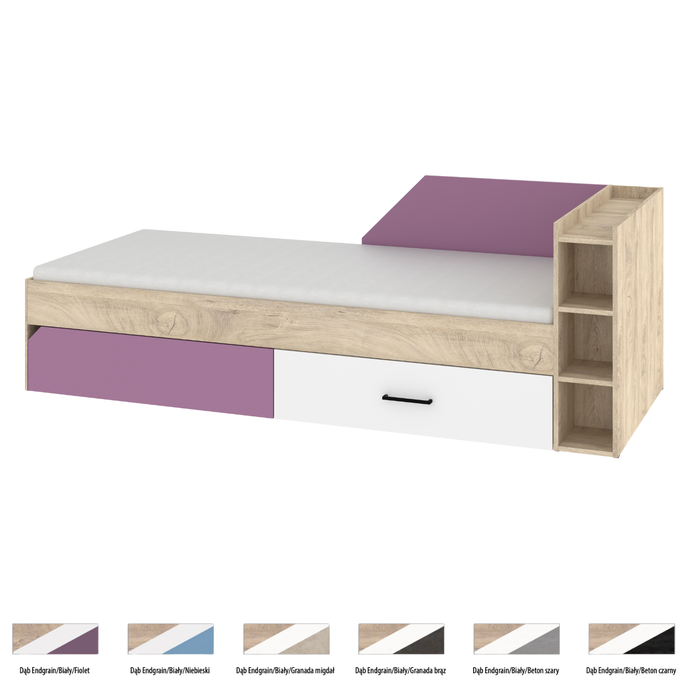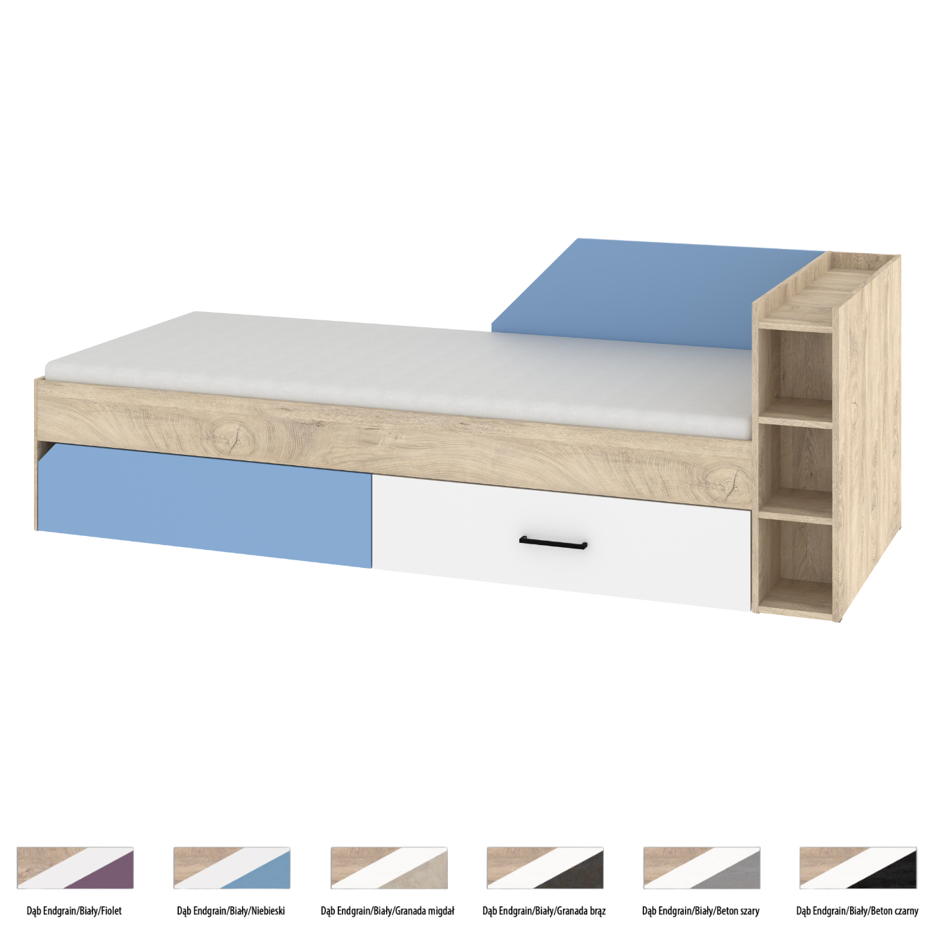 Lova turi du ištraukiamus stalčius., galvūgalis su šoninėmis lentynomis ir vieta daiktams laikyti.