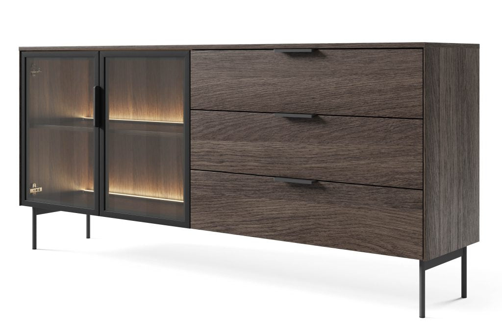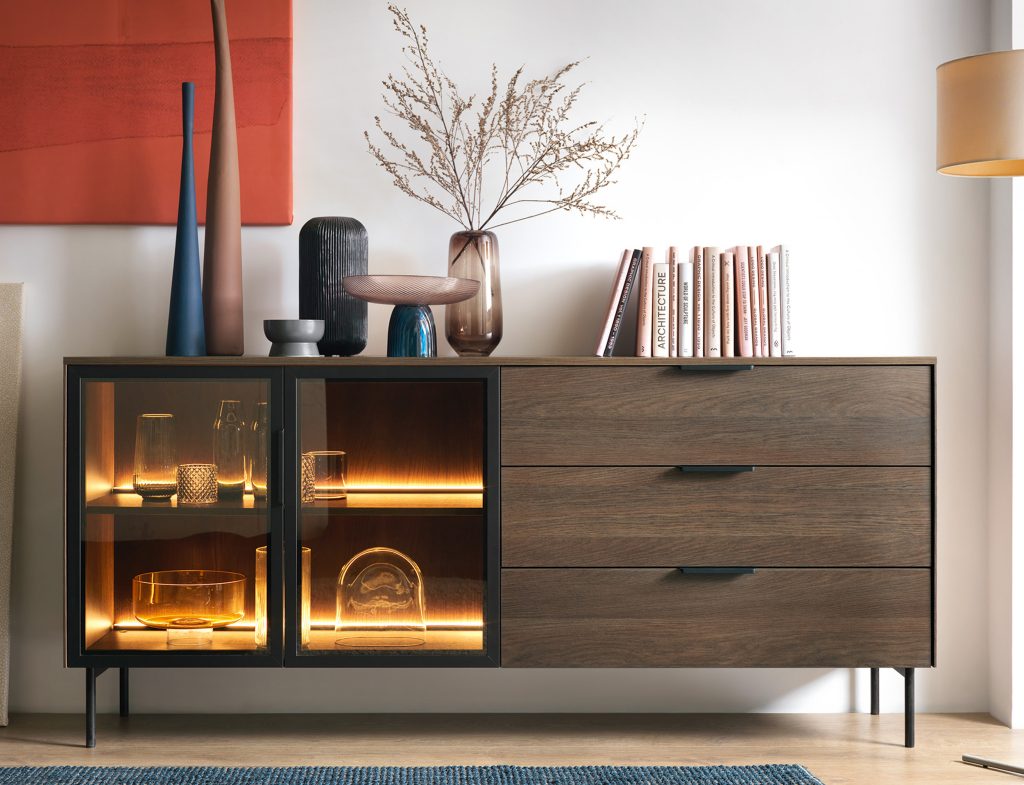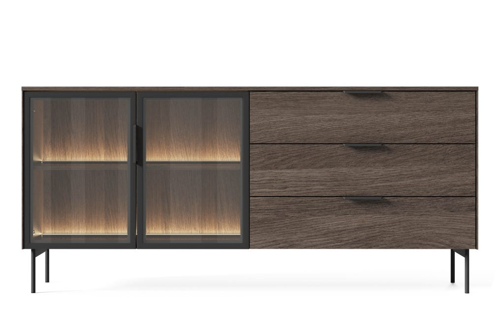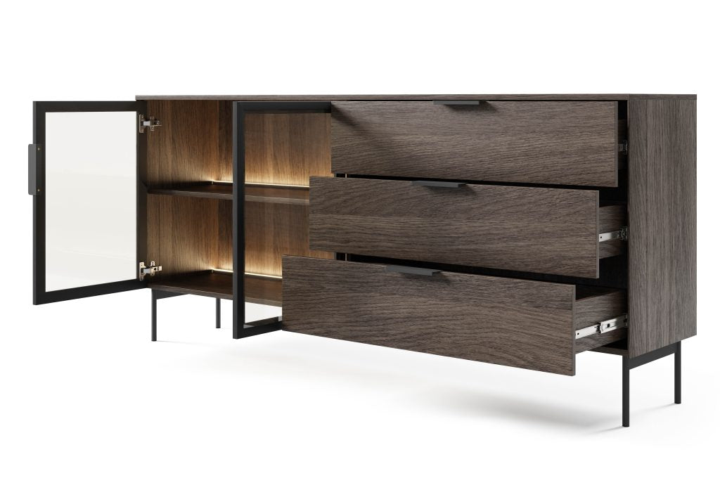 LUMI – elegantiškas ir funkcionalus pasirinkimas. Unikalus dizainas paverčia šią kolekciją ne tik estetiškai patraukliu baldu, bet ir praktišku daiktų laikymo sprendimu, suteikiančiu bet kokiam kambariui asmeniškumo. Grūdinto stiklo fasadai apsaugo vitrinas nuo dulkių ir pažeidimų, tuo pačiu leisdami eksponuoti mėgstamus daiktus. Juodos metalinės kojelės ir rankenos suteikia baldams lengvumo, o apšvietimas sukuria jaukią atmosferą.