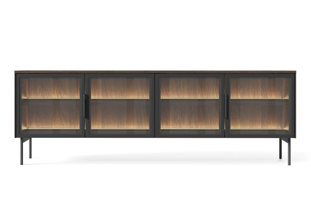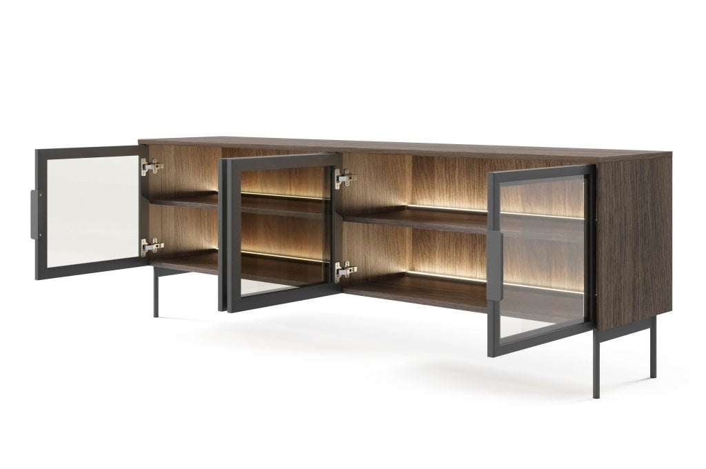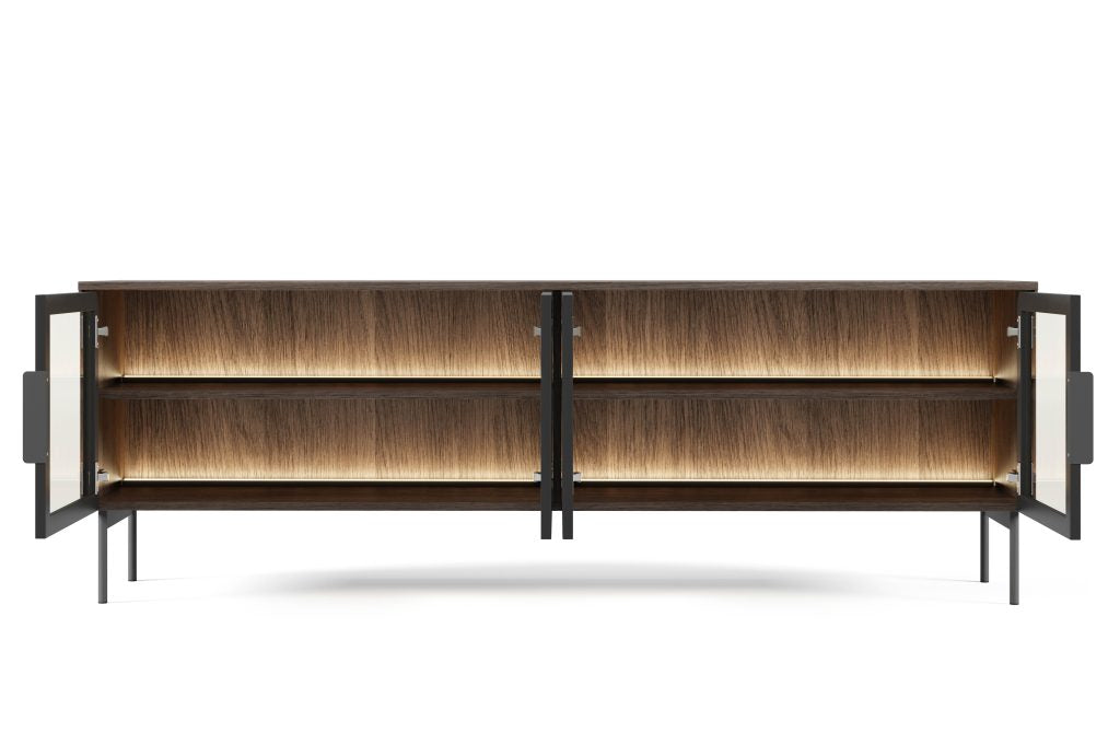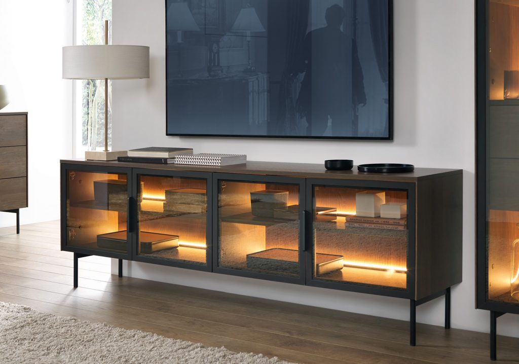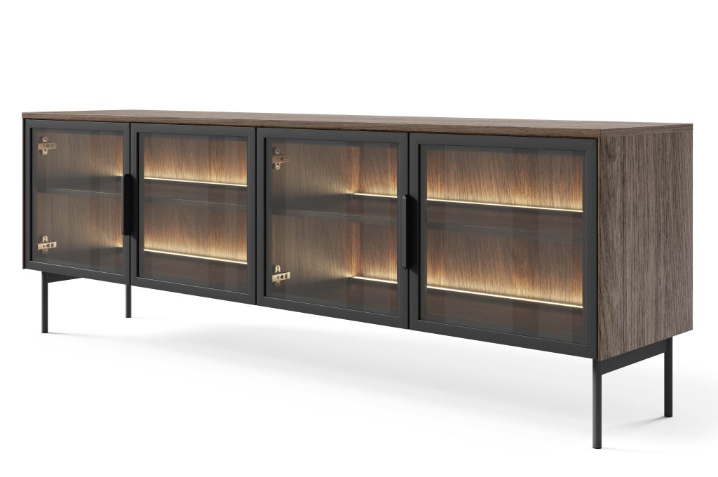 LUMI – elegantiškas ir funkcionalus pasirinkimas. Unikalus dizainas paverčia šią kolekciją ne tik estetiškai patraukliu baldu, bet ir praktišku daiktų laikymo sprendimu, suteikiančiu bet kokiam kambariui asmeniškumo. Grūdinto stiklo fasadai apsaugo vitrinas nuo dulkių ir pažeidimų, tuo pačiu leisdami eksponuoti mėgstamus daiktus. Juodos metalinės kojelės ir rankenos suteikia baldams lengvumo, o apšvietimas sukuria jaukią atmosferą.