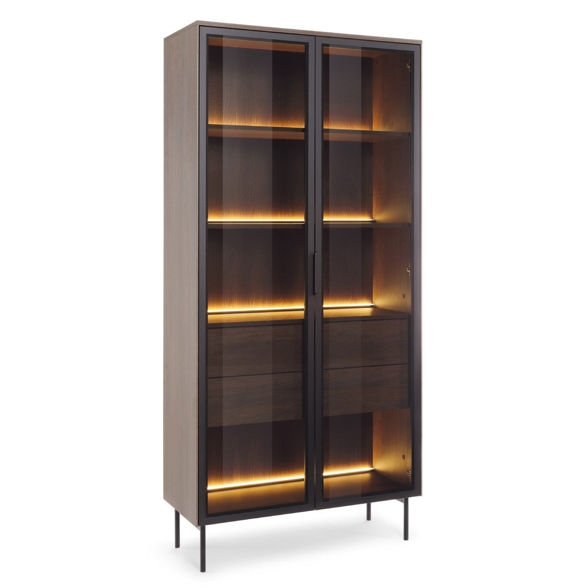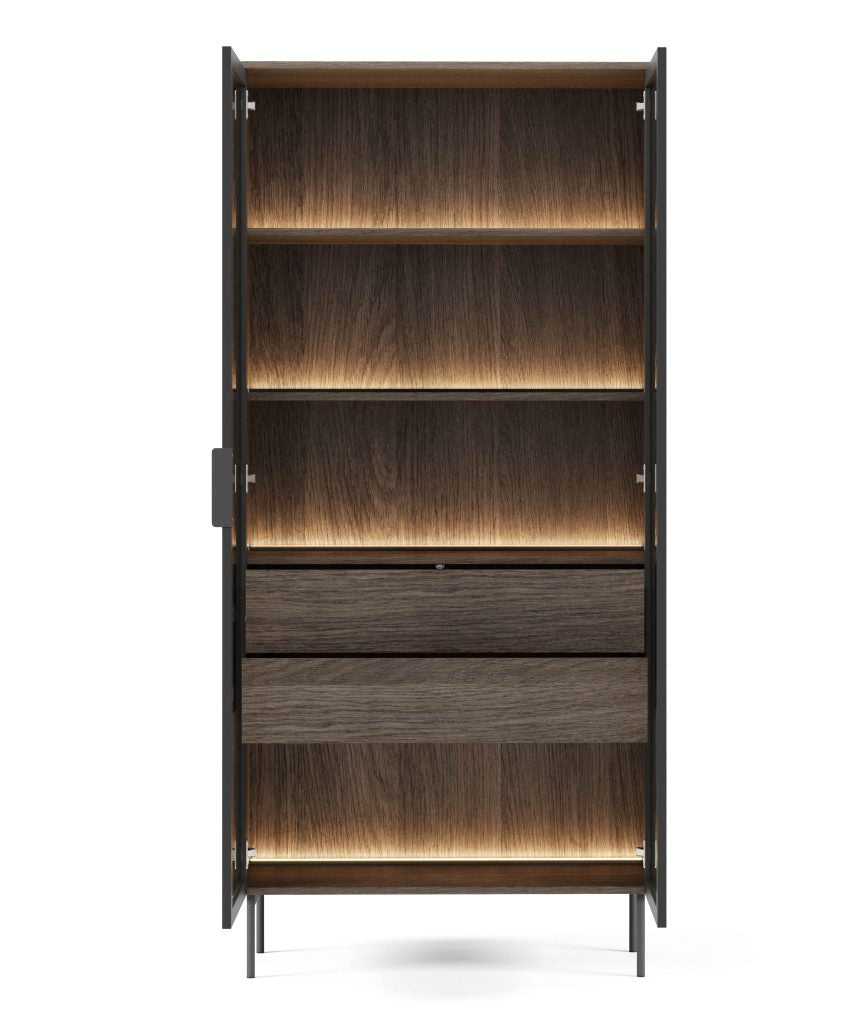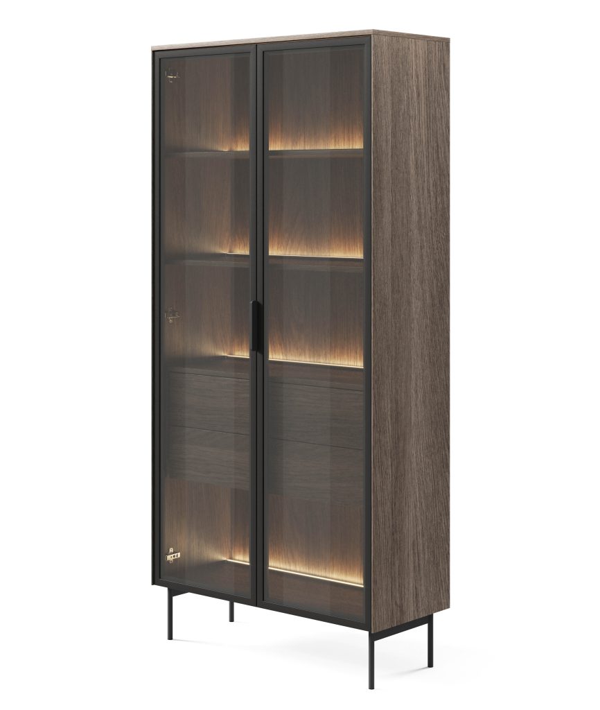 LUMI – elegantiškas ir funkcionalus pasirinkimas. Unikalus dizainas paverčia šią kolekciją ne tik estetiškai patraukliu baldu, bet ir praktišku daiktų laikymo sprendimu, suteikiančiu bet kokiam kambariui asmeniškumo. Grūdinto stiklo fasadai apsaugo vitrinas nuo dulkių ir pažeidimų, tuo pačiu leisdami eksponuoti mėgstamus daiktus. Juodos metalinės kojelės ir rankenos suteikia baldams lengvumo, o apšvietimas sukuria jaukią atmosferą.