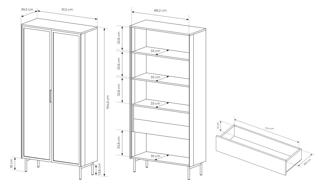 - Plotis 91,5 cm / Aukštis 194,6 cm / Gylis 39,3 cm