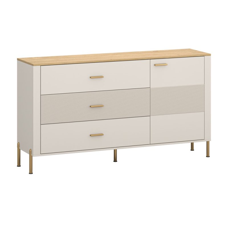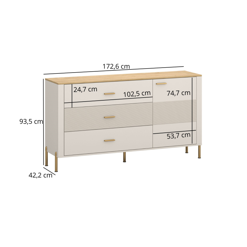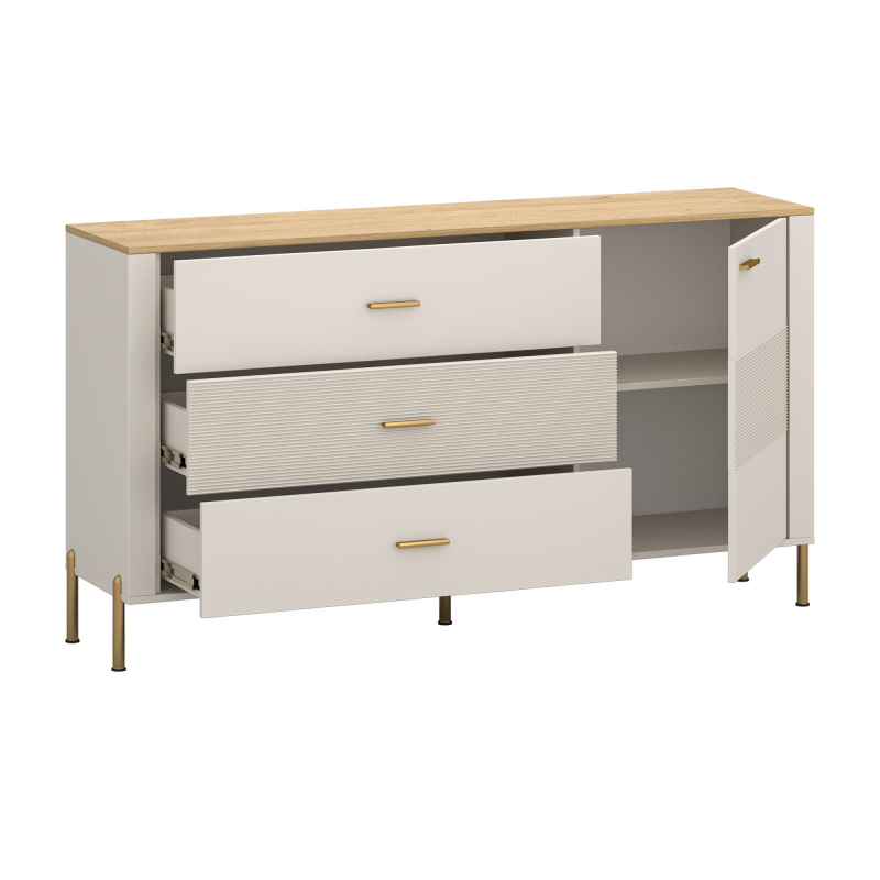 Fasadai: laminuota plokštė, MDF grioveliai padengti PVC folija Fasadų spalva: kašmyras Korpuso medžiaga: laminuota baldų plokštė Korpuso spalva: kašmyras Viršutinė dalis: laminuota baldų plokštė Viršutinės dalies spalva: akmens ąžuolas Stalčiai: rutuliniai guoliai, pilno ištraukimo Metalinės rankenos Metalinė koja Tvirtos lentynos: laminuota baldų plokštė Leidžiama lentynų apkrova [kg] 3 kg Surinkimas: Baldai skirti savarankiškam surinkimui