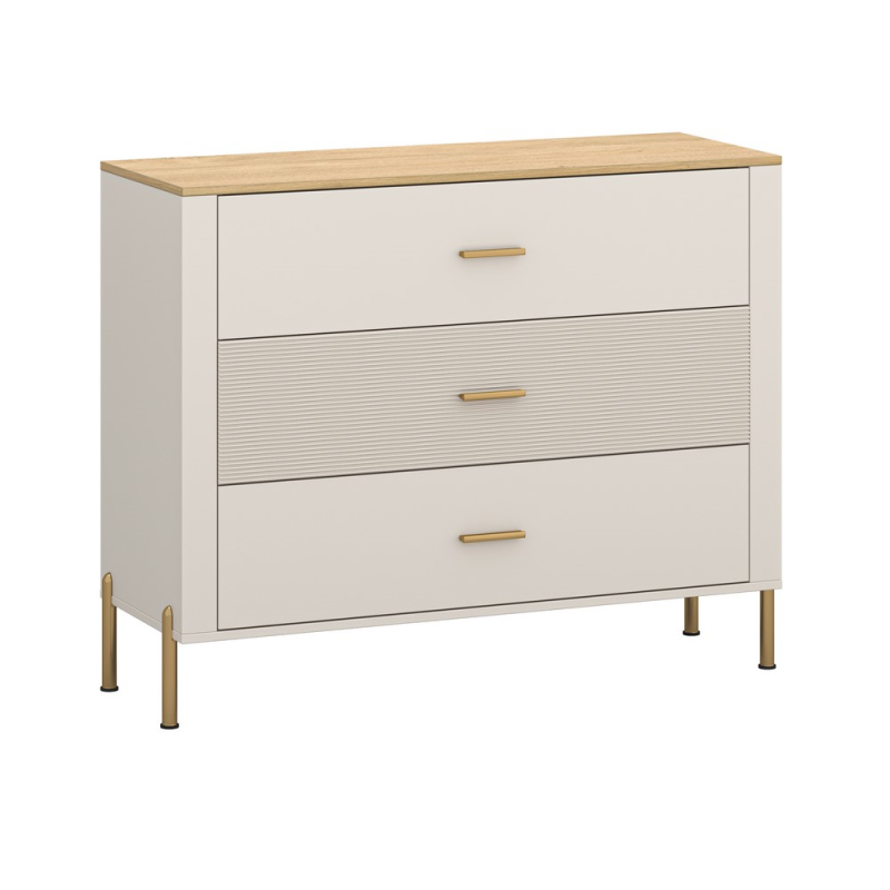 Fasadai: Laminuota plokštė, grioveliais dekoruota MDF plokštė, dengta PVC Fasadų spalva: Kašmyras Korpuso medžiaga: Laminuota baldų plokštė Korpuso spalva: Kašmyras Viršutinė dalis: Laminuota baldų plokštė Viršutinės dalies spalva: Akmens ąžuolas Stalčiai: Su rutuliniais guoliais, pilno ištraukimo bėgeliai Rankenos: Metalinės Kojelės: Plastikas Leidžiama lentynų apkrova [kg] 3 kg Surinkimas: Baldai skirti savarankiškam surinkimui Svoris: 51,8 kg