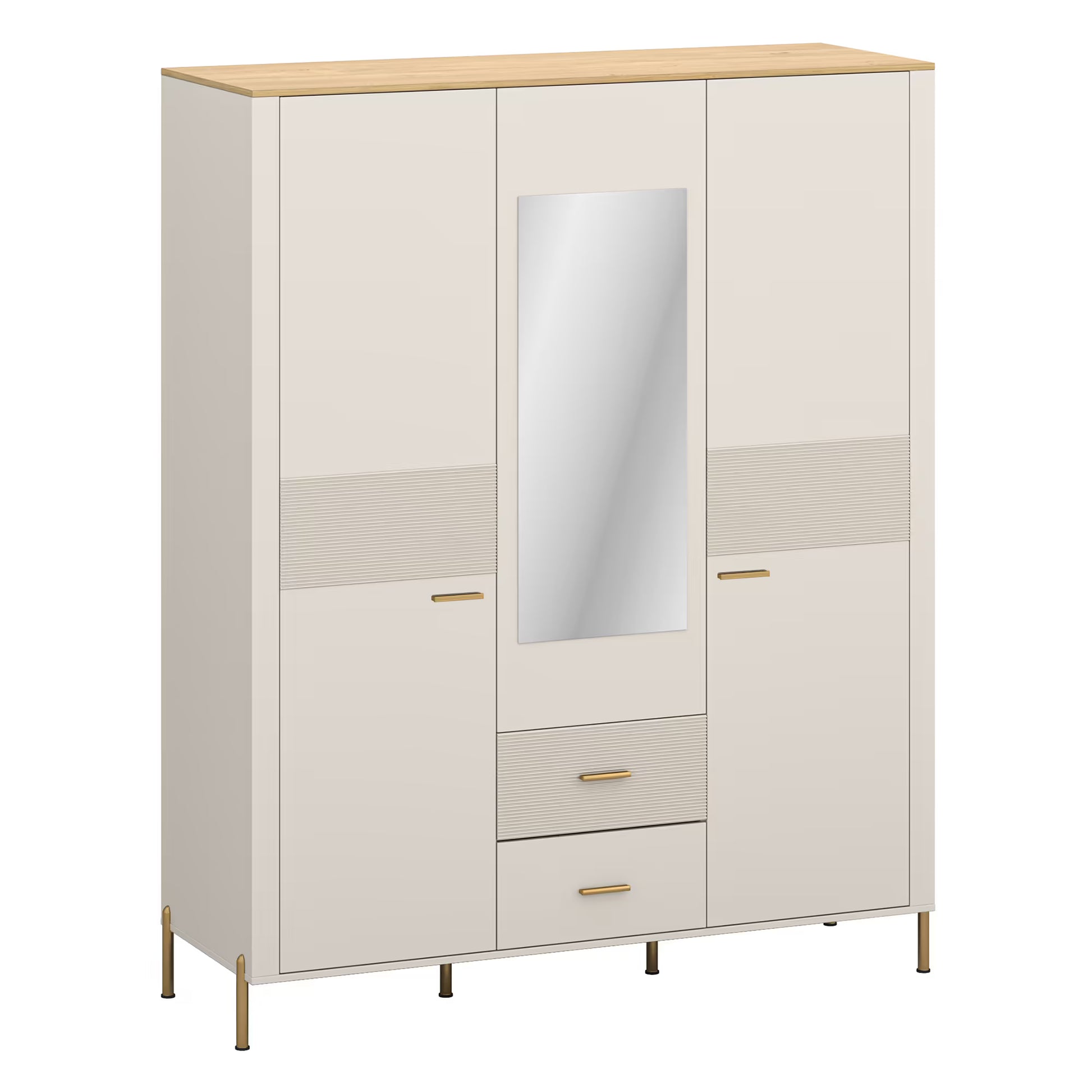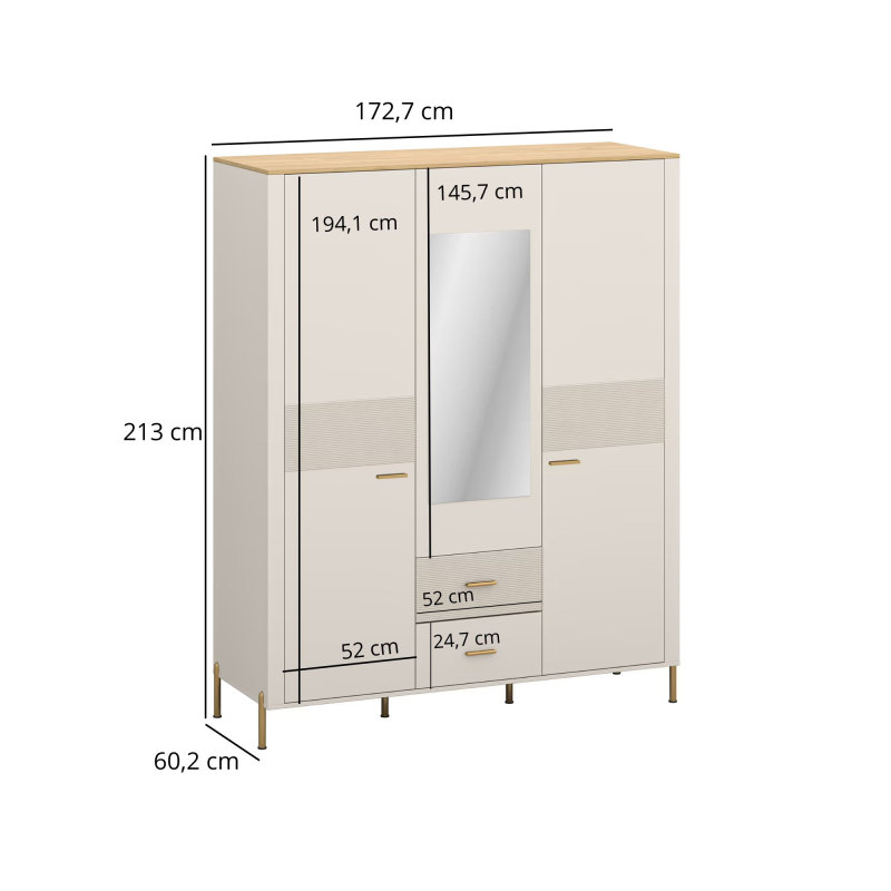 Fasadai: Laminuota plokštė, grioveliais dekoruota MDF plokštė, dengta PVC Fasadų spalva: Kašmyras Korpuso medžiaga: Laminuota baldų plokštė Korpuso spalva: Kašmyras Viršutinė medžiaga: Laminuota baldų plokštė Viršutinės dalies spalva: Akmens ąžuolas Stalčiai: Su rutuliniais guoliais, pilno ištraukimo bėgeliai Metalinės rankenos Metalinės kojelės Tvirtos lentynos: Laminuota baldų plokštė Leidžiama lentynų apkrova [kg] 3 kg Surinkimas: Baldai skirti savarankiškam surinkimui Svoris: 147,8 kg