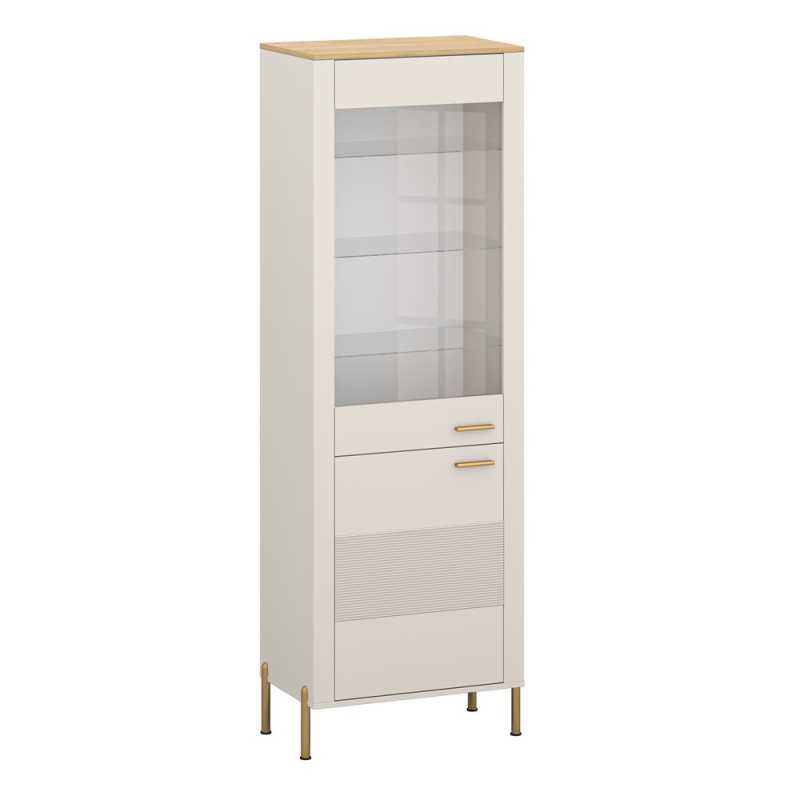Fasadai: Laminuota plokštė, grioveliais dengta MDF plokštė, padengta PVC Fasadų spalva: Kašmyras Stiklo fasadai - Stiklo tipas: Skaidrus Korpuso medžiaga: Laminuota baldų plokštė Korpuso spalva: Kašmyras Viršutinė medžiaga: Laminuota baldų plokštė Viršutinės dalies spalva: Akmens ąžuolas Metalinės rankenos Metalinė koja Tvirtos lentynos: Laminuota baldų plokštė Leidžiama apkrova: Tvirtos lentynos [kg] 3 kg Skaidrios stiklo lentynos Leidžiama apkrova: Stiklinės lentynos [kg] 3 Surinkimas: Baldai skirti surinkti savarankiškai Svoris: 56,8 g