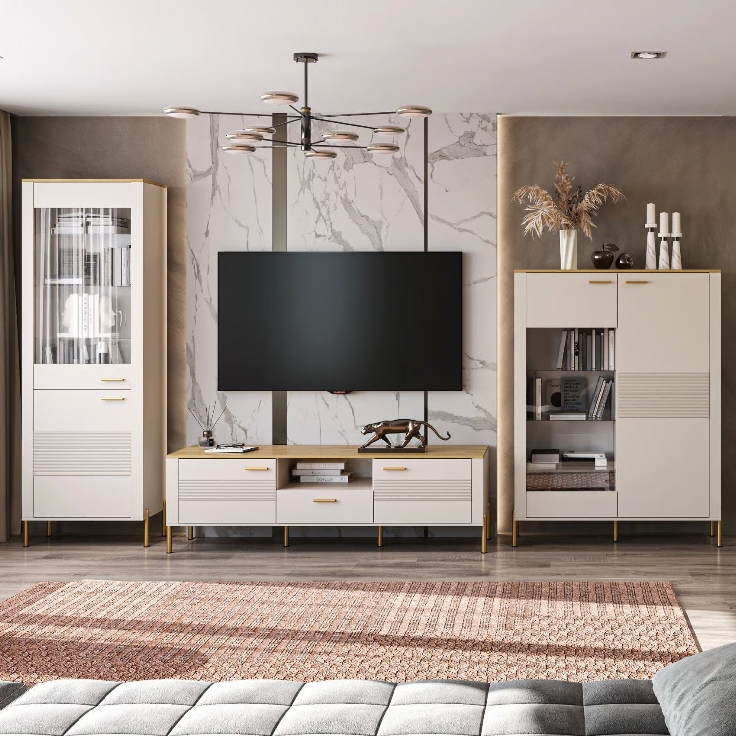 RUBEN - labai gražūs, modernūs ir subtilūs svetainės baldai. Čia derinamos šiltos spalvos, paprastos formos ir subtilūs grioveliai fasaduose. Tai svetainės baldai, kuriuose vyrauja tiek modernus, tiek subtiliai prabangus stilius.