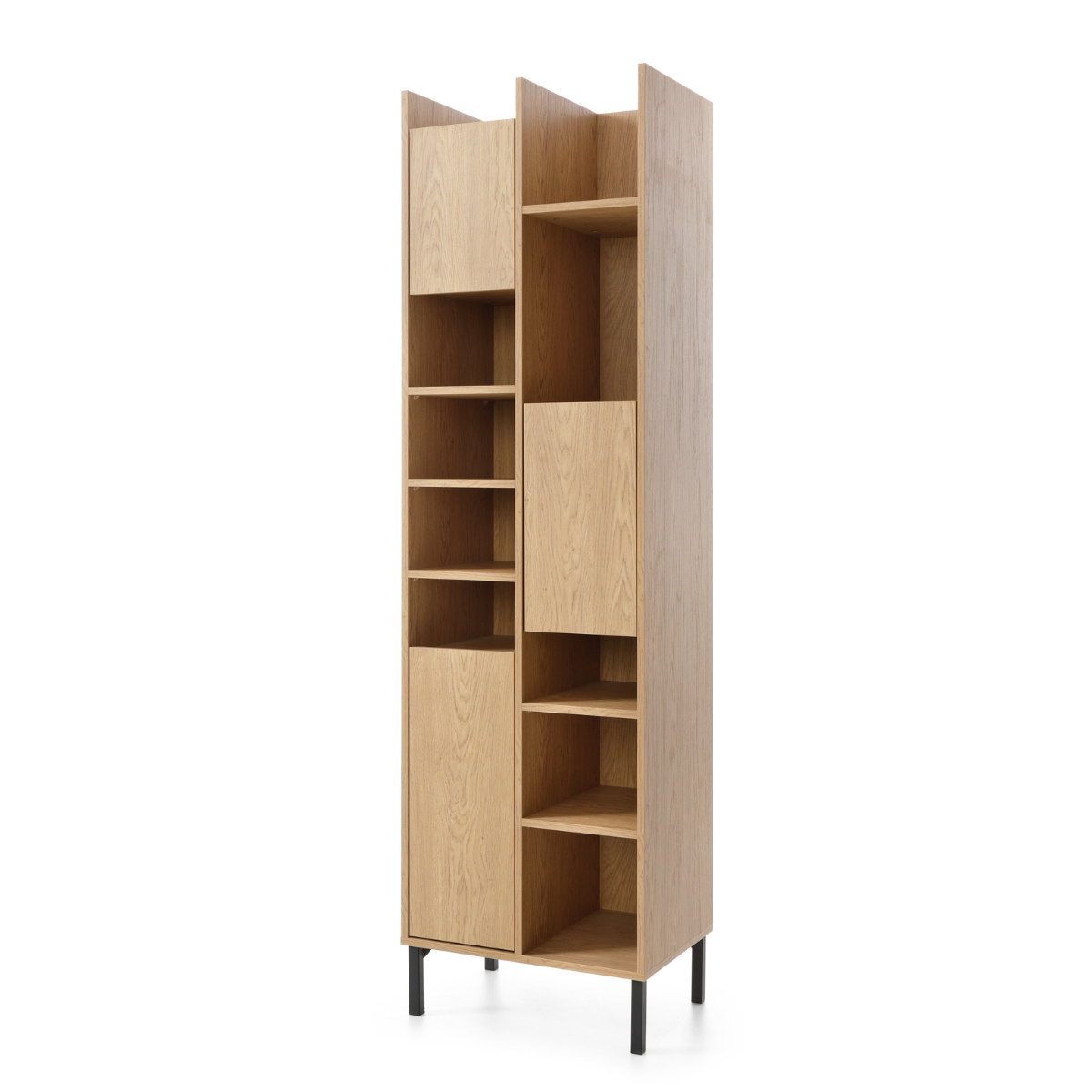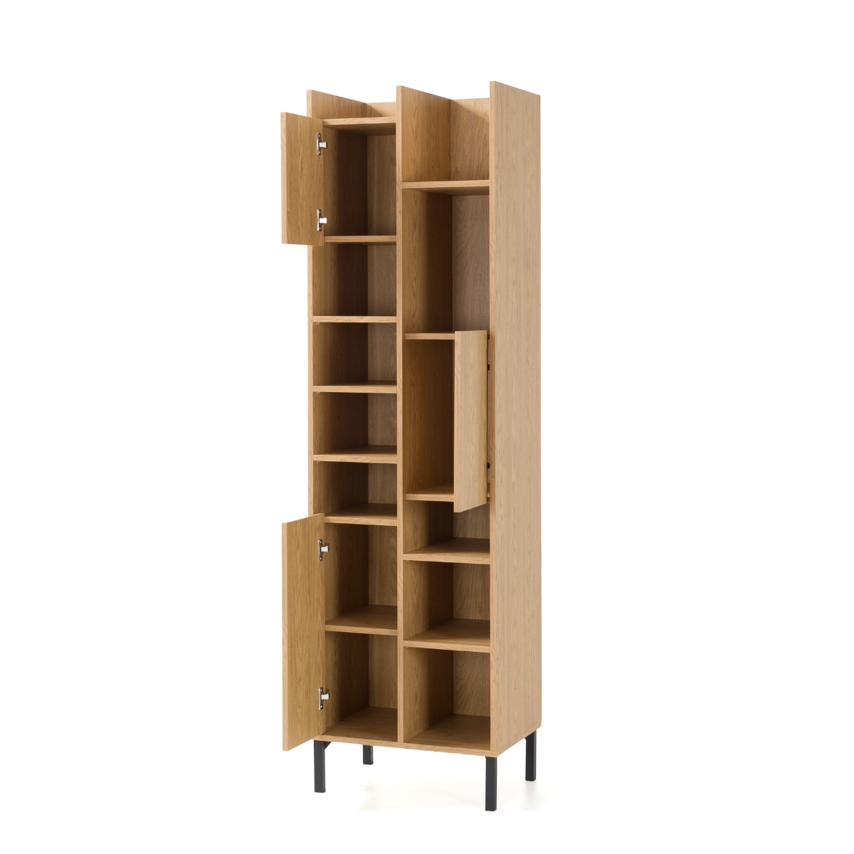 Asimetriškas atvirų lentynų ir uždarų sekcijų išdėstymas sukuria dizaino geometrijos efektą, kuris traukia dėmesį. Šis modelis tinka tiek knygoms, tiek dekoratyviniams daiktams, aksesuarams ar indams laikyti.