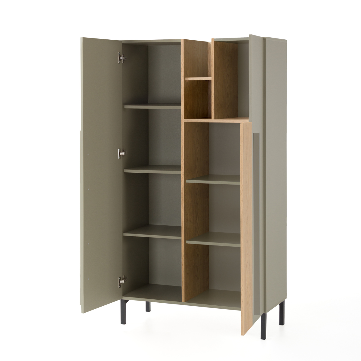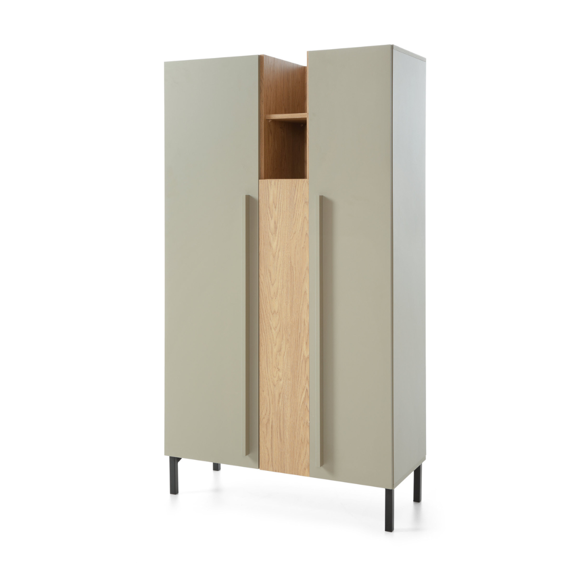 Viduje yra apgalvotas išdestymas: erdvios lentynos drabužiams, dėžėms ir kitiems daiktams laikyti. Spinta stovi ant stabilių juodų kojelių, kurių dėka spinta atrodo lengva ir šiuolaikiška.