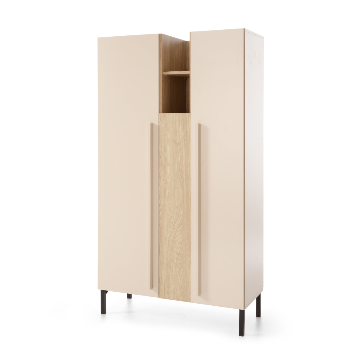 Viduje yra apgalvotas išdestymas: erdvios lentynos drabužiams, dėžėms ir kitiems daiktams laikyti. Spinta stovi ant stabilių juodų kojelių, kurių dėka spinta atrodo lengva ir šiuolaikiška.