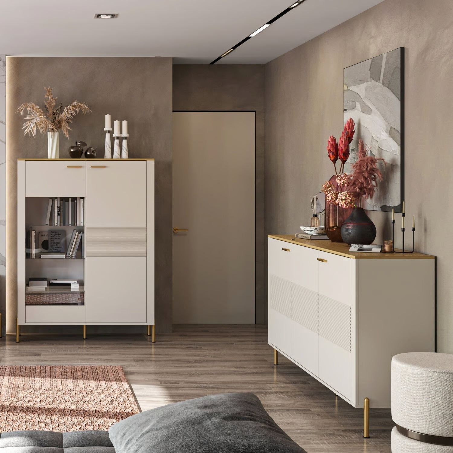 RUBEN - labai graži, moderni ir subtili svetainės baldų kolekcija. Šioje kolekcijoje derinamos šiltos spalvos, paprastos formos ir subtilūs grioveliai fasaduose. Tai kolekcija, kurioje vyrauja tiek modernus, tiek subtiliai prabangus stilius. Kašmyro spalva suteiks kambariui ramybės ir harmonijos. Ąžuolo spalvos stalviršiai suteikia subtilumo, šilumos ir jaukumo pojūtį kambariuose. Auksiniai elementai užbaigia baldus, suteikdami prabangos ir elegancijos.