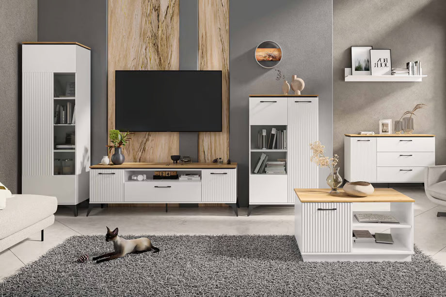 VELUTTO sekciją sudaro: vitrina aukšta, vitrina žema, RTV staliukas.