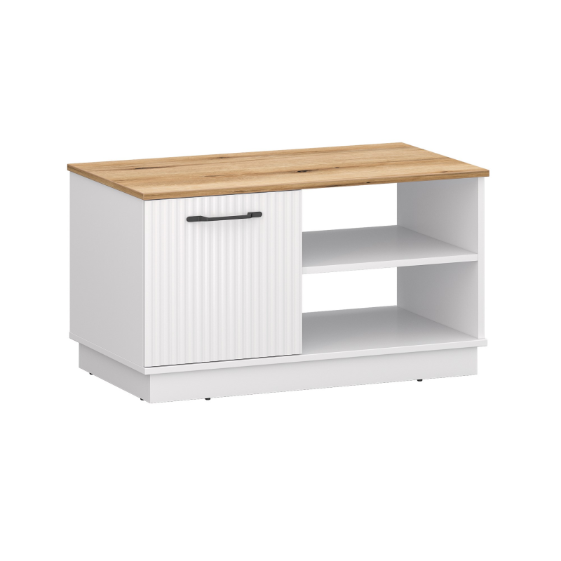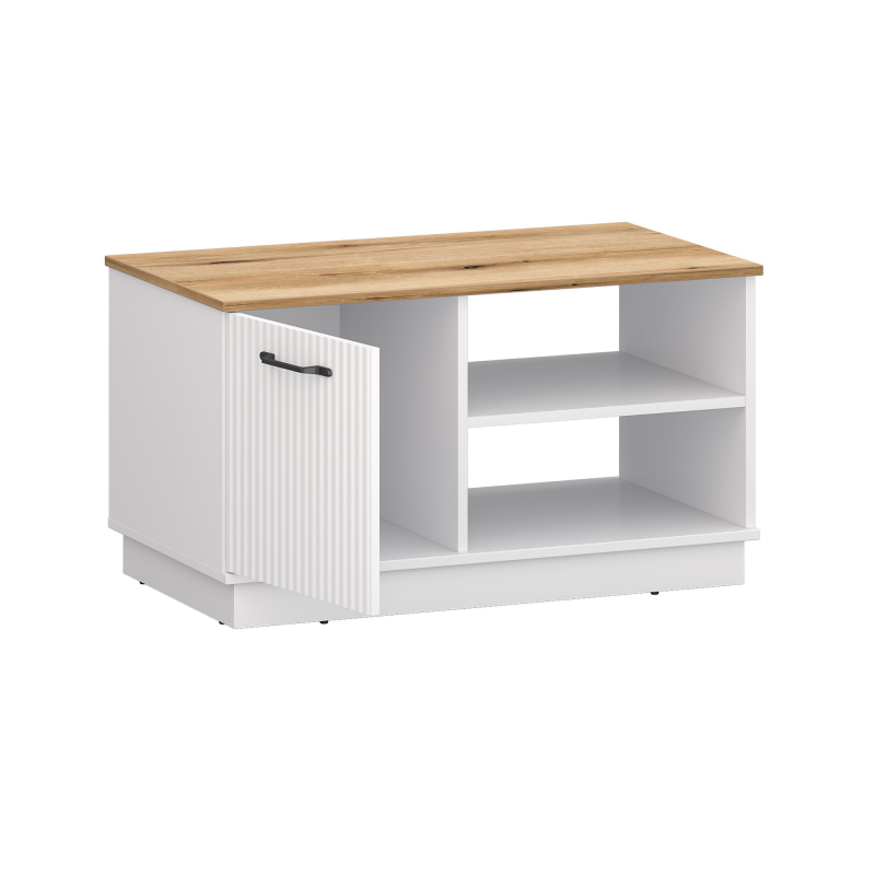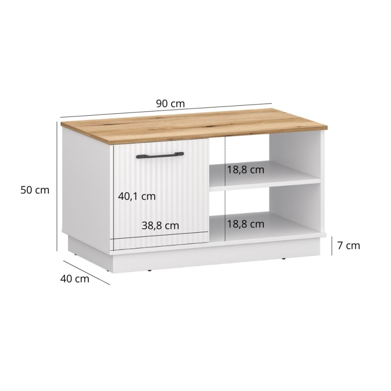 Fasadų medžiaga: MDF plokštė, padengta PVC folija / laminuota baldų plokštė Fasadų spalva: balta Korpuso medžiaga: laminuota baldų plokštė Korpuso spalva: balta / ąžuolas „evok“ Stalviršis: laminuota baldų plokštė Stalviršio spalva: ąžuolas „evok“ Forma: stačiakampė Rankenos: metalinės Kojelė: plastikinis slankiklis Lentynos: laminuota baldų plokštė Leidžiama lentynų apkrova 5 kg Surinkimas: Baldai supakuoti plokščiose pakuotėse, skirti savarankiškam surinkimui Svoris: 21,4 kg